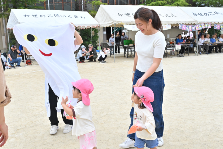 8月30日(土)には、夏の終わりを告げる風の子保育園恒例の『納涼祭』が開催れました。園庭には遊びのコーナーを設置、ホールには子どもたちの作品が展示されておりフォトスポットとなっていました。浴衣や甚平さん姿の祭ならではの装いをした子どもたちの笑顔、保護者の方々の笑顔、職員の笑顔にあふれる、楽しい納涼祭になりました。